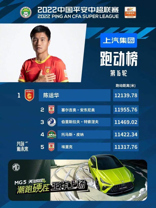 中超第16輪補賽結束,中超官方公佈了第16輪的跑動榜。其中,河北隊球員陳運華以12139.78米高居榜首,塞爾吉奧·安東尼奧位居第二,伯里斯拉夫·特索涅夫位居第三。
