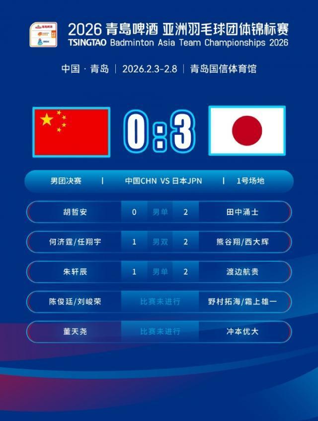 亞洲羽毛球團體錦標賽男團決賽,國羽總比分0比3負於日本隊,無緣衛冕賽事冠軍。這是日本隊首次奪得亞團賽男團冠軍。日本男團也自12年前湯杯以來,首次擊敗中國隊。對陣賽果如下: