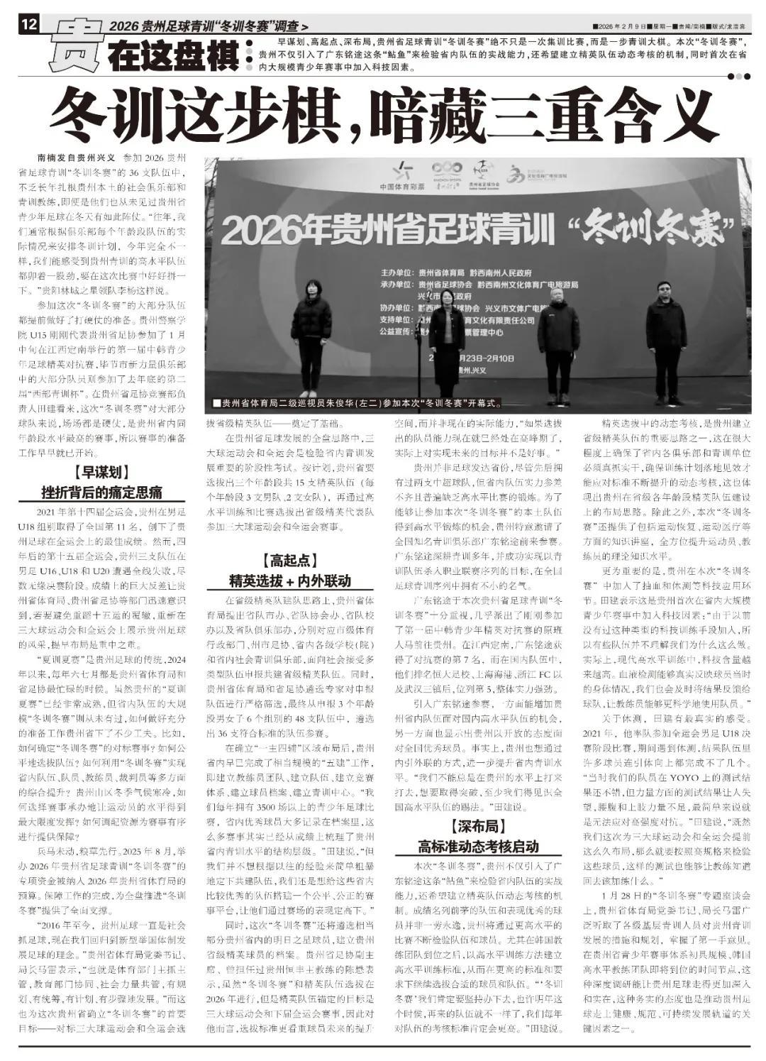 南楠發自貴州興義 參加2026貴州省足球青訓“冬訓冬賽”的36支隊伍中,不乏長年紮根貴州本土的社會俱樂部和青訓教練,即便是他們也從未見過貴州省青少年足球在冬天有如此陣仗。“往年,我們通常根據俱樂部每個年齡段隊伍的實際情況來安排冬訓計劃,今年完全不一樣,我們能感受到貴州青訓的高水平隊伍都鉚着一股勁,要在這次比賽中好好拼一下。”貴陽林城之星領隊李楊這樣說。
