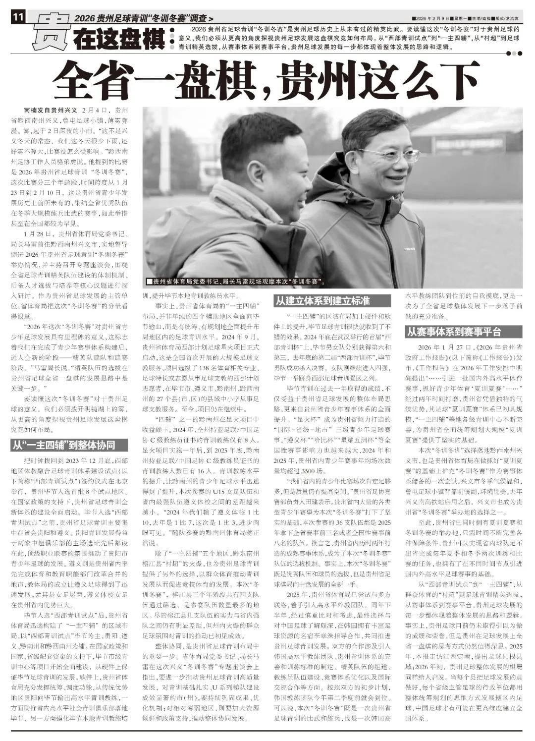 從“西部青訓試點”到“一主四輔”,從羣衆體育的“村超”到足球青訓精英選拔,從賽事體系到賽事平臺,貴州足球發展的每一步都體現着整體發展的思路和邏輯。事實上,貴州足球目前仍未取得引以爲傲的成績和榮譽,但是貴州在足球發展上全省一盤棋的思考方式仍然值得深思。2025年,本報走訪江西定南,提出足球紮根縣域;2026年初,貴州足球整體發展的棋局同樣給人啓發。當每個縣把足球發展的點做好,每個省級主管足球的行政單位都用整體統籌規劃的思維方式發展轄區內足球,中國足球纔有可能在更高維度建立全國體系。