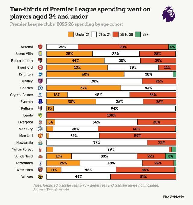 TA:英超球隊49%的轉會支出流向了21至24歲年齡段的球員