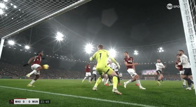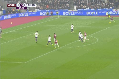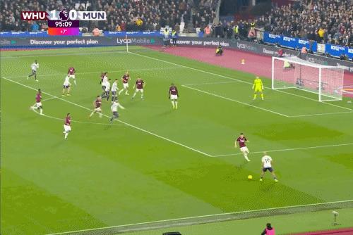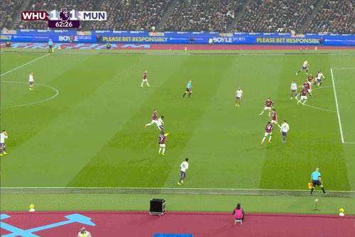 第50分鐘,鮑文右路低平球傳中,前點紹切克搶點將球捅入,西漢姆1比0曼聯。