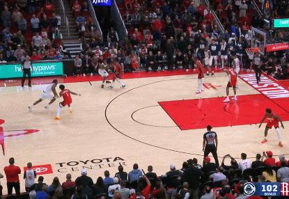 但萊昂納德操作的時候還增加了一些欺騙性,他沒有選擇直接向右生突,而是先佯裝突左路,用一個轉身成功擺脫了阿門·湯普森,最後還吸引泰特過來賠了一個2+1。