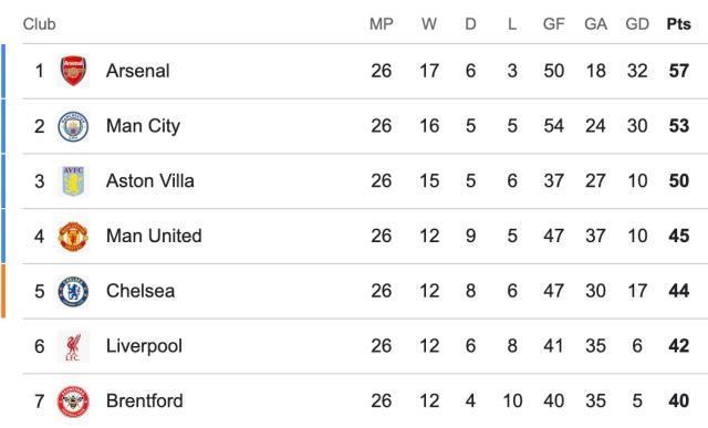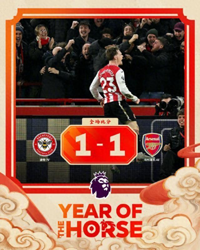 英超第26輪,阿森納客場1比1被布倫特福德逼平,領先優勢被縮減到4分。