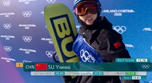 第一輪比賽,蘇翊鳴第10位出發,他穩穩完成了道具區和大跳臺,但是沒有上高難度。完成第一輪之後,蘇翊鳴自己還比較滿意,他揮拳吶喊。蘇翊鳴第一輪拿到70.83分。
