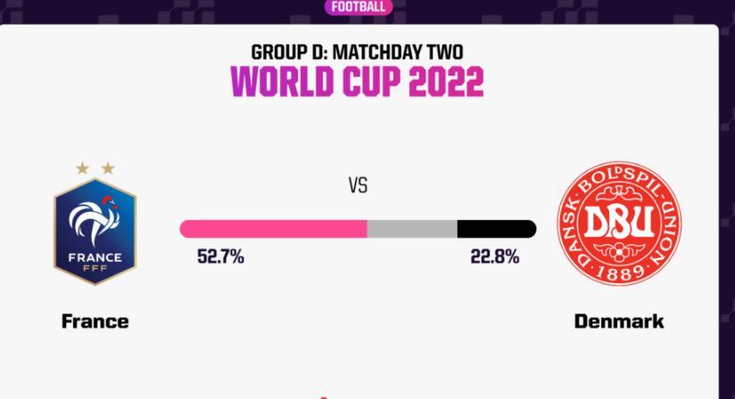 法國是更被看好的一方,他們取得兩連勝的可能性爲52.7%,而丹麥獲勝的可能性爲 22.8%,平局的可能性爲 24.5%。