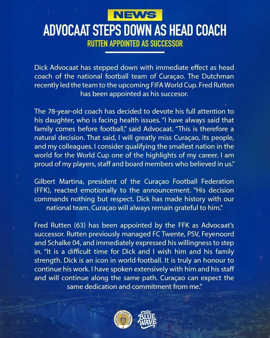 庫拉索出線後,艾德沃卡特曾表示自己當時愛妻心切,匆匆離開庫拉索隊有些過於着急。當他回到家中時,才獲悉妻子的病情並不算嚴重。而因爲主教練無法現場指揮,庫拉索險些無緣出線,艾德沃卡特也差點錯過時隔20年再次帶隊征戰世界盃的機會。但這次,艾德沃卡特的辭職決定經過了深思熟慮。未來數月他將全身心照顧罹患重病的女兒,無力兼顧教練職務,只能選擇放棄。庫拉索隊醫範艾克也一併離職,爲艾德沃卡特陪伴女兒提供必要的醫療幫助。