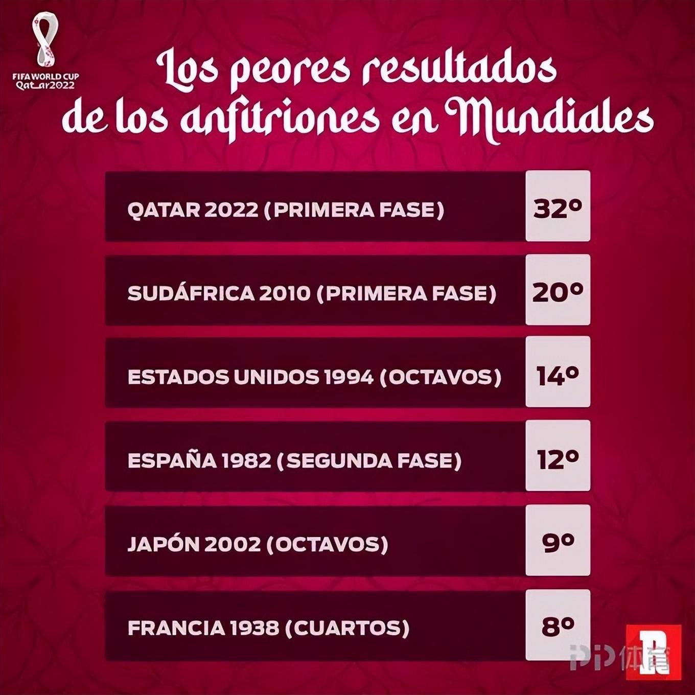 據墨西哥《紀錄報》統計,卡塔爾是世界盃歷史上成績最差的東道主,最終排名第32位。