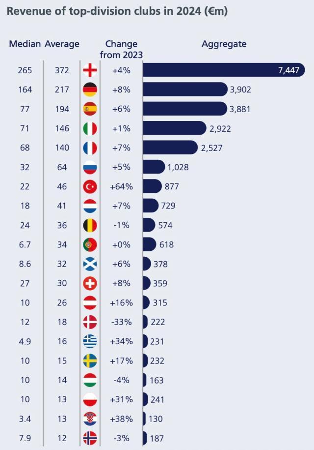 收入排名前20的聯賽中,有16個聯賽在2024年實現了收入增長。英格蘭俱樂部繼續創造最多的收入,儘管其收入佔比從27%下降到26%。德國俱樂部的收入中位數是西班牙、意大利或法國俱樂部的兩倍多。