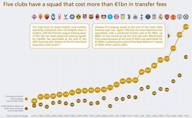歐洲足壇目前共有5家10億俱樂部,英超佔2025財年末身價排名前10的球隊中的7支。上榜的25傢俱樂部中有16家刷新了俱樂部歷史最高紀錄。切爾西在2025財年末的陣容身價再次創下新高,總轉會費高達17.46億歐元,比他們去年創下的紀錄高出9000萬。