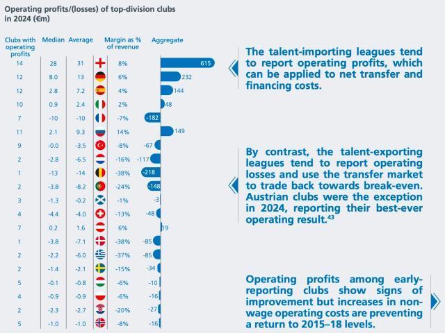 報告指出,人才引進型聯賽往往盈利,這些利潤可用於支付淨轉會費和融資成本。相比之下,人才輸出型聯賽往往運營虧損,並利用球員買賣以期實現收支平衡。