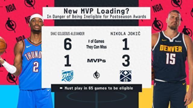 北京時間2月28日,NBA官網更新最新一期MVP榜,亞歷山大和約基奇繼續位列榜單的前二位,但兩人都存在因場次不足無法參與MVP評選的隱患。截至目前,亞歷山大最多還可以缺席6場比賽,約基奇最多還能缺席一場。