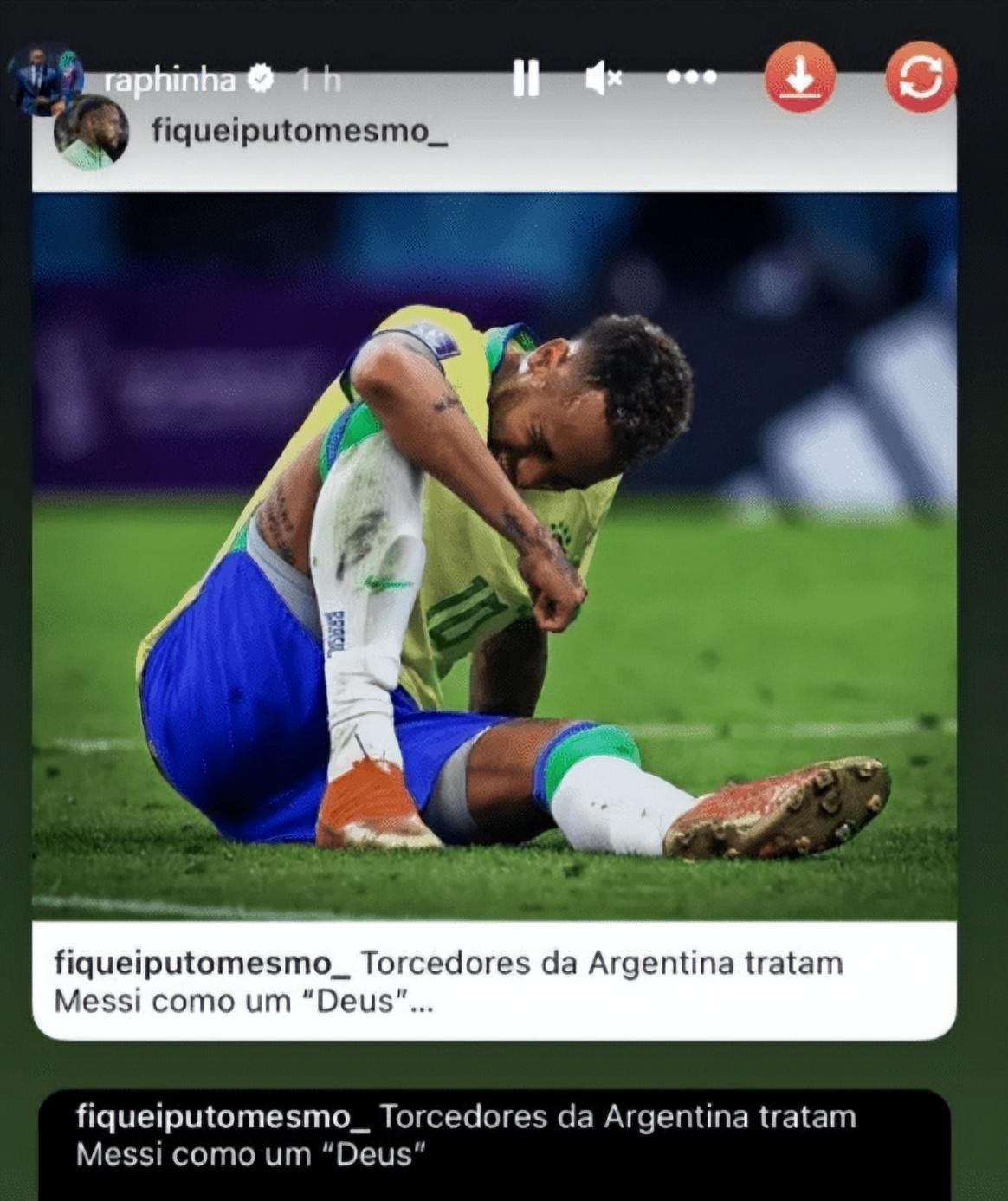內馬爾受傷後,拉菲尼亞發文力挺,聲稱內馬爾受到巴西人的不公平待遇,“阿根廷球迷將梅西當做神,葡萄牙球迷將克里斯蒂亞諾-羅納爾多當成國王,可是看看巴西人,是如何對待內馬爾的。”