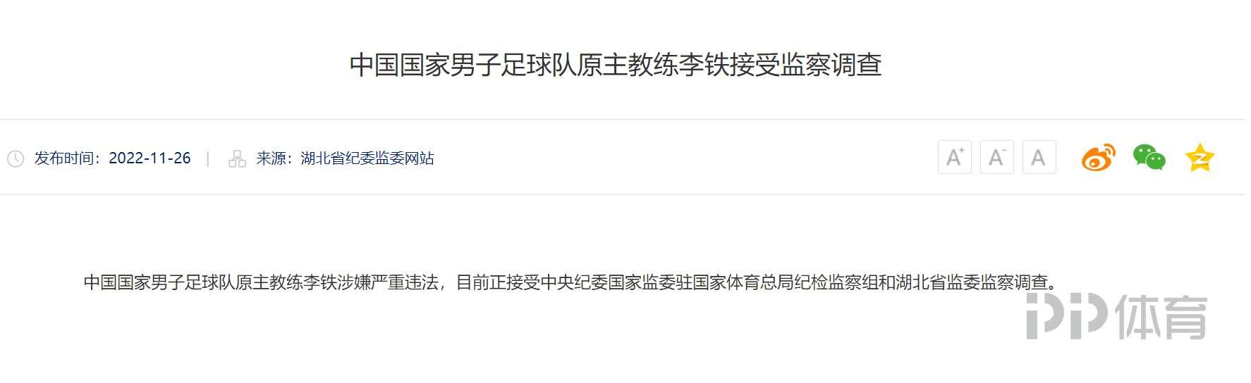 據湖北省紀委監委網站11月26日消息,中國國家男子足球隊原主教練李鐵涉嫌嚴重違法,目前正接受中央紀委國家監委駐國家體育總局紀檢監察組和湖北省監委監察調查。不久前足協舉辦的職業級教練培訓線下會議上,李鐵在會上被有關部門帶走調查。據此前消息,李鐵被帶走是因爲武漢卓爾的舉報,卓爾董事長田旭東也被帶走調查。李鐵2020年1月出任國足主帥,2021年12月辭職,正式比賽戰績爲5勝3負2平,進24球丟12球。