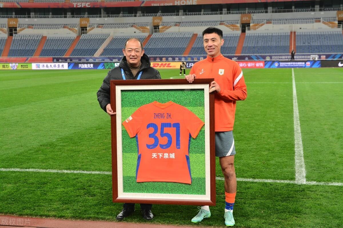 北京時間11月26日,2022賽季中超聯賽第27輪山東泰山坐鎮主場迎戰武漢長江。憑藉克雷桑、陳蒲、莫伊塞斯、阿卜杜肉蘇力以及郭田雨的進球,泰山隊以5比0大勝武漢長江。本場比賽,鄭錚迎來了自己職業生涯的又一個里程碑:爲泰山俱樂部總出場次數達到351場,位列隊史第一。賽前,俱樂部爲他舉辦了球衣贈送儀式。