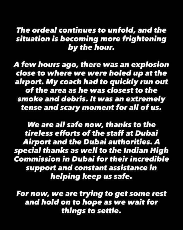 多虧了迪拜機場工作人員和迪拜當局的不懈努力,我們現在都安全了。特別感謝印度駐迪拜高級專員公署,他們爲保障我們的安全提供了令人難以置信的支持和持續的協助。