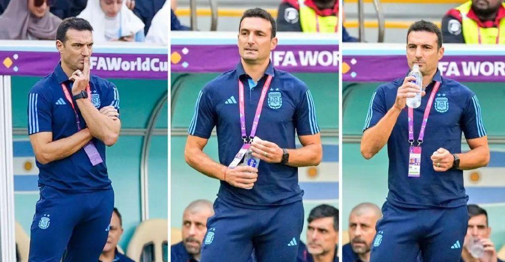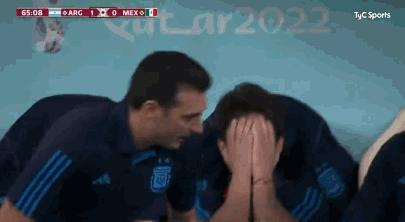 整個上半場,梅西都在墨西哥人的包圍中掙扎,阿根廷也在掙扎。半場補時階段,場邊眉頭緊鎖的斯卡洛尼拿起一瓶水,抿了一口水,左手叉腰,右手不斷將頭髮向後捋。他很焦躁,只是他不能讓自己的焦躁像看臺上的阿根廷球迷那樣表露出來。