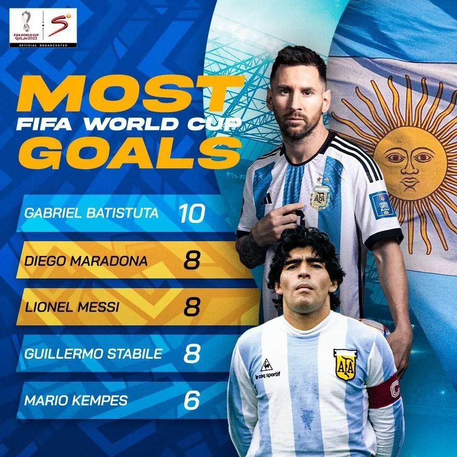 本場比賽,梅西追平了馬拉多納保持的阿根廷隊史世界盃出場紀錄——21場,而這粒進球也讓梅西的世界盃進球數來到8球,再次追平C羅——這同樣也是老馬在世界盃賽場留下的進球數字,而在阿根廷隊史射手榜上,僅次於打進10球的巴蒂斯圖塔。值得一提的是,本場的傳射表現還讓梅西創造了35歲155天的世界盃單場傳射最年長的紀錄。而這一數據最年輕的保持者,也是梅西(18歲357天)。