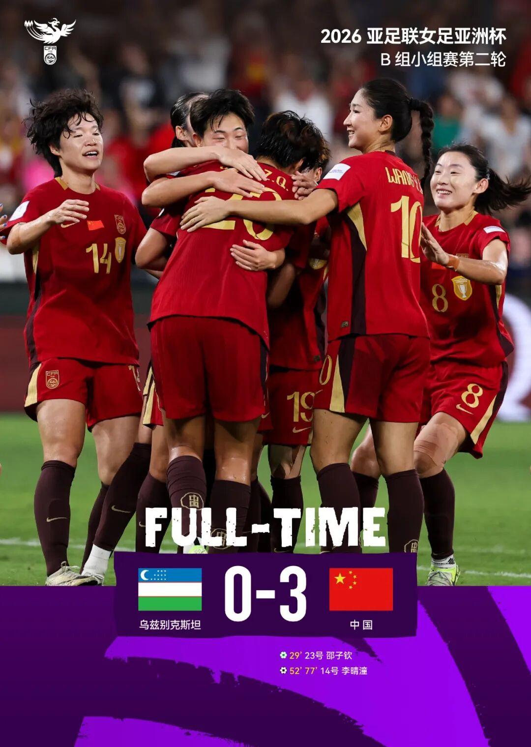 兩連勝晉級!女足亞洲盃:中國3比0烏茲,李晴瞳雙響、邵子欽破門!下輪戰朝鮮!