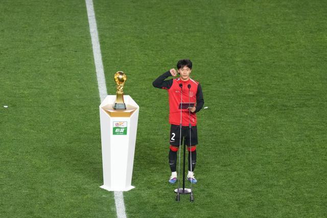 作爲開幕式最具儀式感的核心環節,萬衆矚目的火神杯交接儀式如期而至。在4位身着怡寶服裝的小朋友的引領下,上賽季冠軍上海海港隊代表手捧火神杯步入球場,中國足球職業聯賽聯合會紀委書記盧曉嵐與華潤飲料(控股)有限公司黨委副書記、執行董事、總裁李樹清共同接過火神杯並放置在球場中央的杯託上,太陽神鳥圖案在場中浮現,火神杯在光影中熠熠生輝。這尊承載着夢想與汗水的獎盃,不僅是聯賽冠軍榮譽的至高象徵,更是中國職業足球精神的傳承載體。