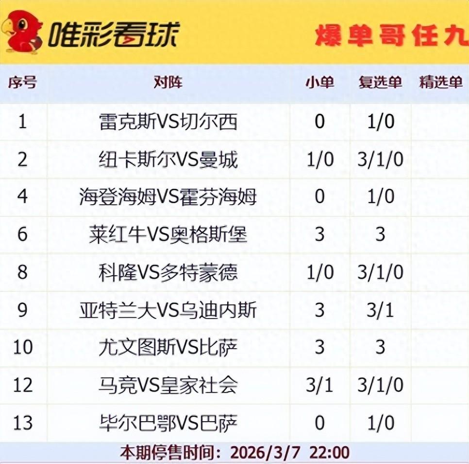 本期勝負彩任九的競猜場次由英格蘭足總盃、德國甲級聯賽、意大利甲級聯賽、西班牙甲級聯賽和法國甲級聯賽共同組成,賽事分佈較爲分散,需結合各聯賽特點進行綜合考量。以下是本期中幾場關鍵比賽的分析與建議: