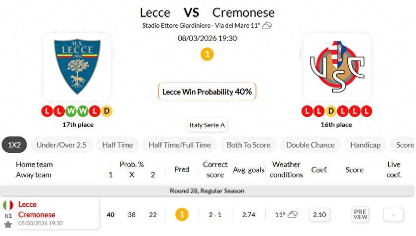 -Lecce are unbeaten in 2 of the last 3 meetings with Cremonese