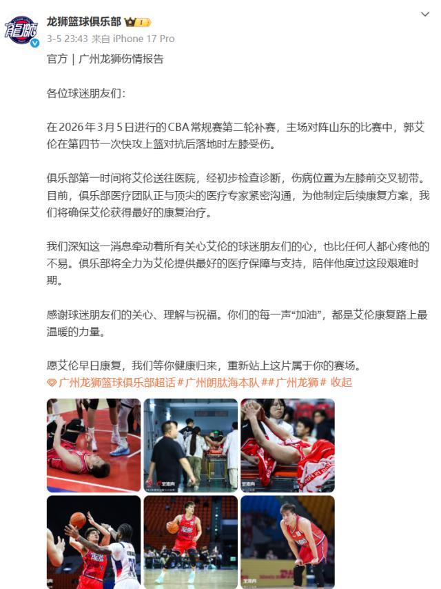 檢查結果顯示,郭艾倫遭遇左膝前交叉韌帶撕裂。