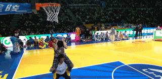 第二位出戰的是張鼎巖,陳登星通過雙人雙架的方式參與到了配合中。張鼎巖衝向籃筐,高高躍起後接球從雙人頭上飛過,完成背扣,拿到50分的滿分。