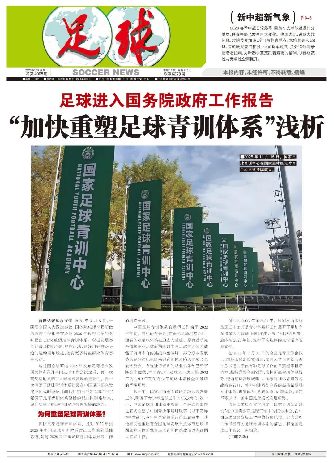 首席記者陳永報道 2026年3月5日,十四屆全國人大四次會議,國務院總理李強所做的政府工作報告在介紹2026年政府工作任務時提出,加快重塑足球青訓體系。積極發展賽事經濟、冰雪經濟、戶外運動,建好用好羣衆身邊的運動場地設施,培育更多特色羣衆體育賽事活動。