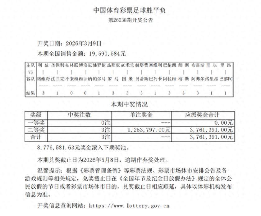 北京時間3月9日,足球彩票第26038期開獎結果揭曉。本期競猜由意甲、德甲、西甲、法甲等歐洲主流聯賽組成,由於冷門賽果集中爆發,導致頭獎空開,獎金滾存至下期獎池。