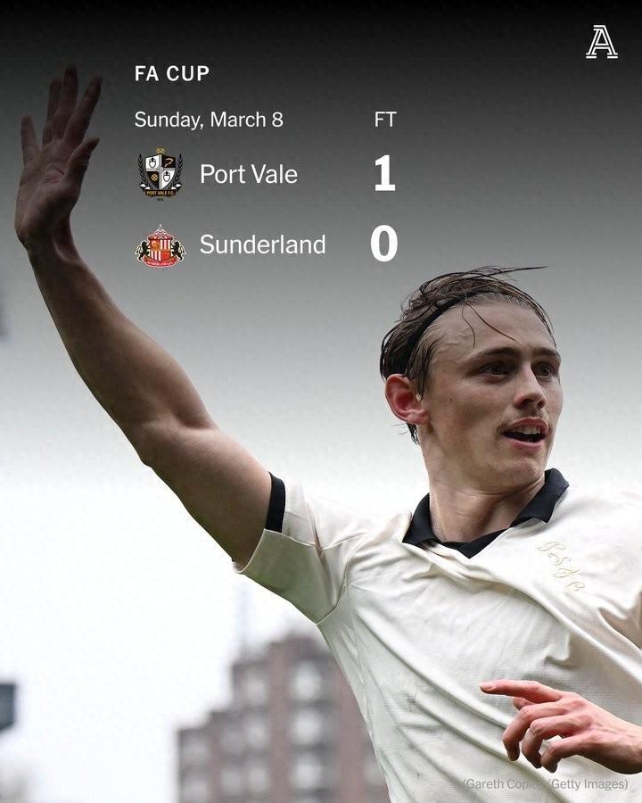 北京時間3月8日晚,英格蘭足總盃1/8決賽上演了一場不可思議的對決。來自英格蘭第三級別聯賽、目前在英甲積分榜墊底的維爾港(Port Vale),在主場維爾公園球場以 1-0 的比分奇蹟般地擊敗了英超球隊桑德蘭,隊史第二次闖入足總盃八強。而打入全場唯一進球的英雄——本·韋恩,用一次特殊的慶祝動作,讓這場勝利變得更加意味深長。