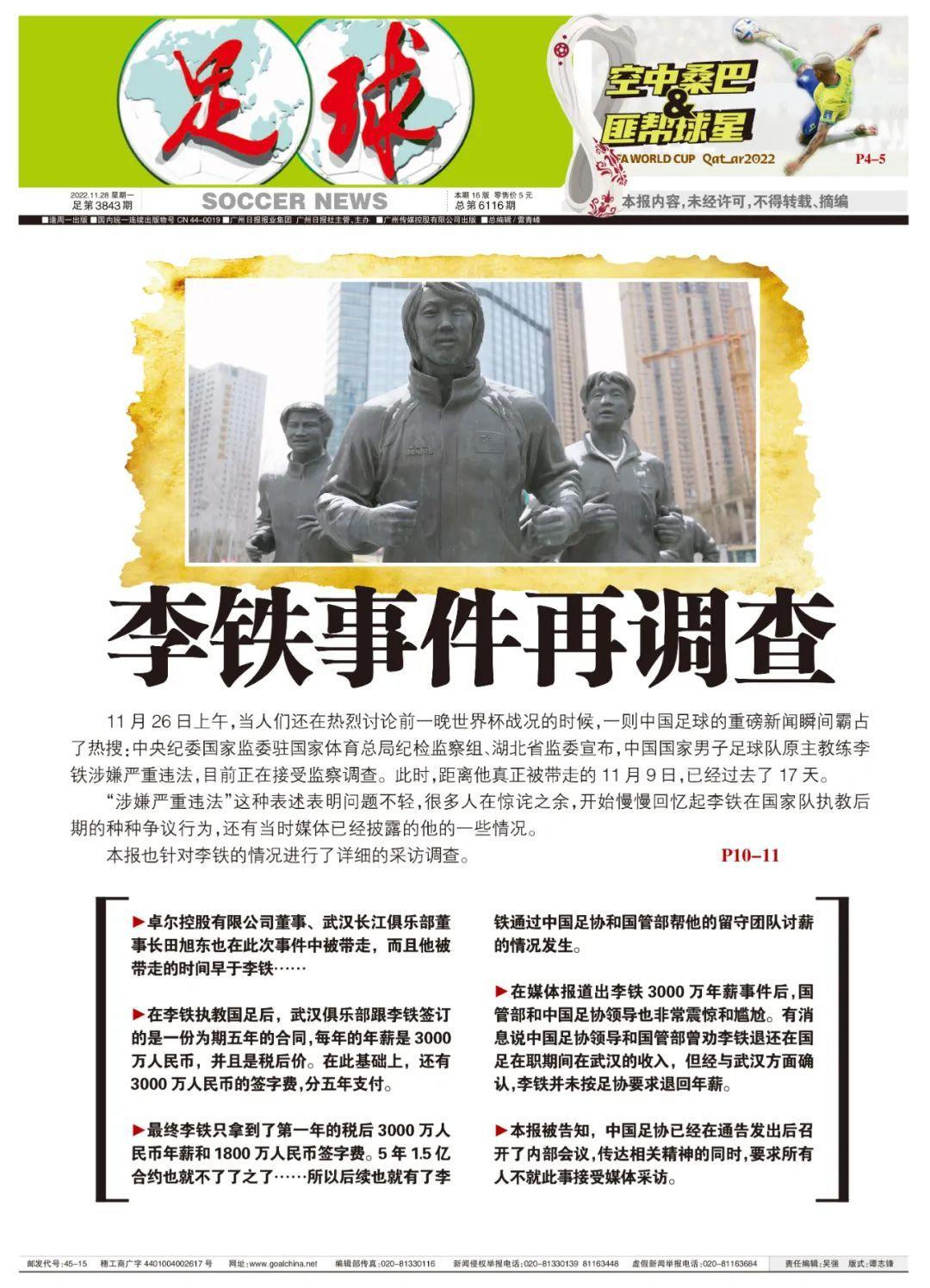 記者程善報道 11月26日上午,當人們還在熱烈討論前一晚世界盃戰況的時候,一則中國足球的重磅新聞瞬間霸佔了熱搜:中央紀委國家監委駐國家體育總局紀檢監察組、湖北省監委宣佈,中國國家男子足球隊原主教練李鐵涉嫌嚴重違法,目前正在接受監察調查。此時,距離他真正被帶走的11月9日,已經過去了17天。