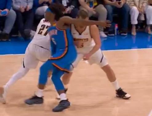 今日掘金客場再戰雷霆,比賽進行到還剩下1分鐘左右時,以116比123落後的掘金髮動進攻。約基奇上提爲穆雷設置掩護,多爾特在擠過掩護的過程中,左手手肘向後甩動,結結實實地打在了約基奇的面門上。再度遭到多爾特襲擊的約基奇捂臉倒地。裁判在觀看了回放之後,將這次犯規升級成爲了一級惡意。