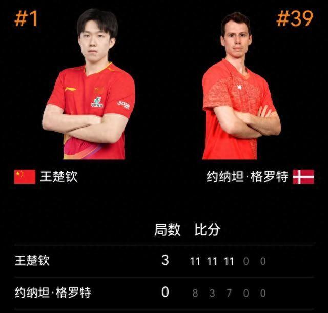 首局比賽,雙方還處於一定的適應和摸索階段,王楚欽在局末時分頂住格羅特的攻擊,11比8先下一城。第二局王楚欽明顯掌握了比賽節奏,打出一波10比1的小高潮,最終11比3再贏一局,第三局儘管對手想通過相持進行反撲,但王楚欽不給對方任何機會,最終11比7鎖定勝局,3比0取得首秀的完勝。