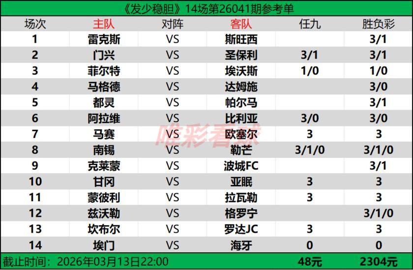 【發少穩膽26041期勝負彩14場(2304元)任九(48元)推薦方案】
