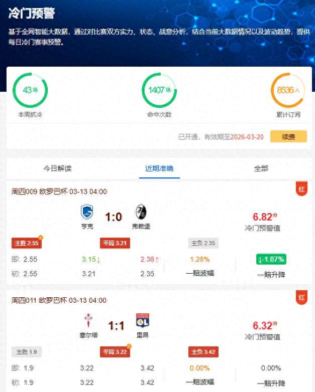 昨日歐羅巴杯亨克VS弗賴堡的比賽中,儘管初始數據顯示弗賴堡取勝的概率較大(勝平負2.55:3.21:2.35),但比賽最終打出了1-0勝的冷門。同時公推塞爾塔1-1平里昂(勝平負1.9:3.22:3.42)等7場比賽同樣命中。比賽賽果充分展現了我們工具的精準預測能力。