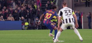45+7’亞馬爾直塞,費爾明橫傳門前,特里皮爾拉倒包抄的拉菲尼亞,裁判起初未作表示,VAR介入後改判點球+黃牌,亞馬爾操刀勁射,拉姆斯代爾觸到皮球仍未能阻止皮球入網,巴薩3比2。