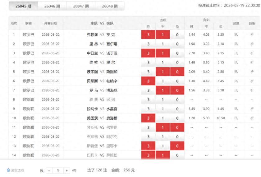 本期勝負彩由7場歐聯杯和7場歐協聯組成,共計14場較量。從對陣形勢看,皇家貝蒂斯vs帕納辛納科斯、羅馬vs博洛尼亞等對話看點十足。然而,多支球隊遭遇的嚴重傷病潮成爲本期最大變數——歐羅巴賽場,里昂三線均有主力受傷,塞爾塔前場受損嚴重,維拉中後場傷4主力,羅馬鋒線三員大將無法上場,博洛尼亞傷主力門將;歐協聯賽場,美因茨防線傷3主力,佛羅倫薩後防大閘缺陣。