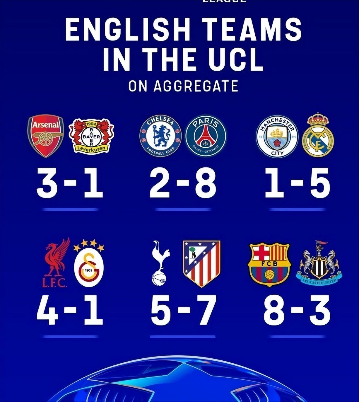 但這兩抹亮色,終究難以掩蓋其餘四隊的黯淡。英超六隊晉級八強的數量,甚至不及西甲的三隊。昔日的聯賽優勢,在歐戰賽場蕩然無存。