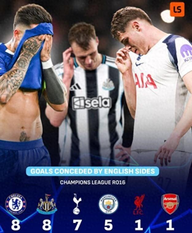 當歐冠1/8決賽次回合的終場哨聲全部吹響,英超六強交出的答卷堪稱慘不忍睹。6支球隊僅有阿森納、利物浦艱難晉級八強,其餘四隊悉數折戟。12場比賽狂丟30球的數字,讓“世界第一聯賽”的光環在這一刻碎得徹底。熱刺贏球出局、切爾西創隊史最差失球紀錄、曼城遭皇馬雙殺、紐卡被巴薩血洗——英超球隊在歐戰賽場的集體潰敗,比首回合的低迷更令人瞠目結舌。