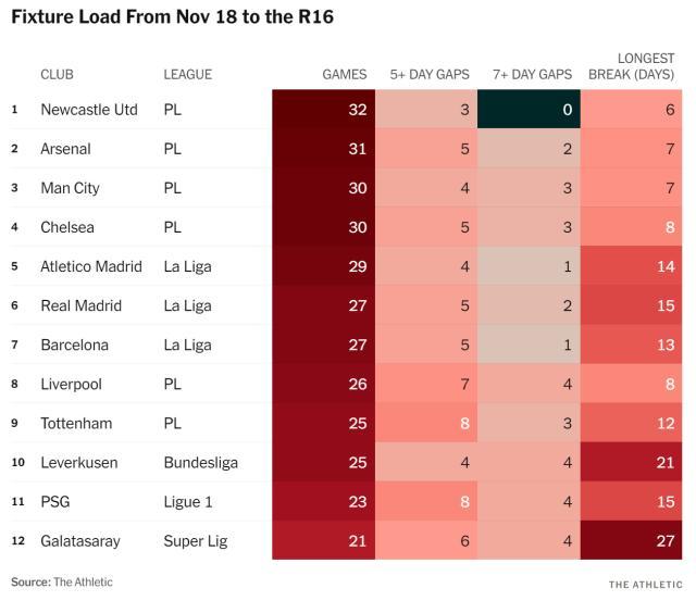 英超球隊沒有冬休,比賽數量更多,是事實。競技網一週前的數據顯示,本季五大聯賽,比賽數量前4名,被紐卡斯爾聯、阿森納、曼城、切爾西這4支英超球隊包攬。本週一組新數據,則揭示了從11月國際比賽周到歐冠16強之間的更鮮明對比。上述英超4隊最多打了32場比賽,皇薩則只有27場。