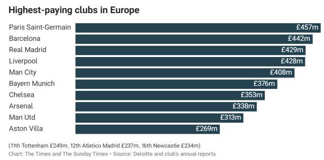 英超整體經濟體量舉世第一,轉會總開銷也往往抵上其他四大聯賽之和,這都是事實。但必須指出,在最頂尖豪門的領域,英超不僅競技實力對比“皇薩仁黎”往往處於下風,就比錢,英超豪門經常也是相對“貧窮”的那個。