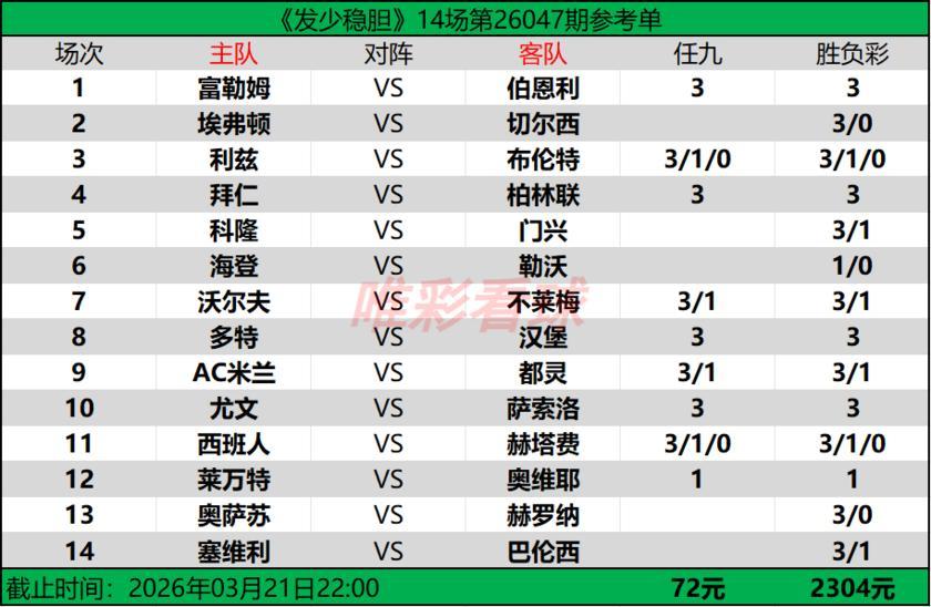 【發少穩膽26047期勝負彩14場(2304元)任九(72元)推薦方案】