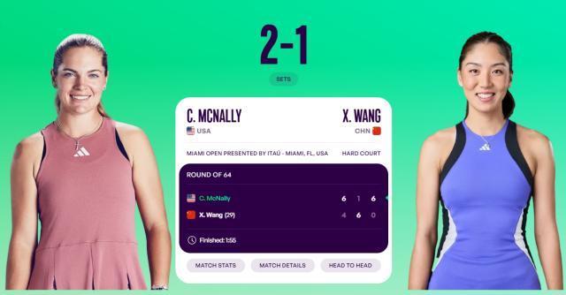 03月21日訊 WTA1000邁阿密站第二輪,29號種子王欣瑜4-6、6-1、0-6不敵麥克納莉,無緣32強,陽光雙賽遭遇背靠背首戰出局。