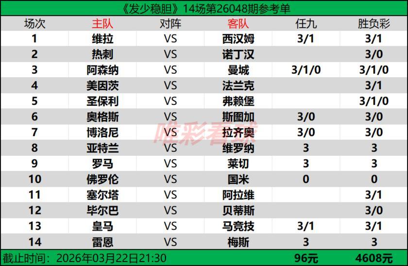 【發少穩膽26048期勝負彩14場(4608元)任九(96元)推薦方案】