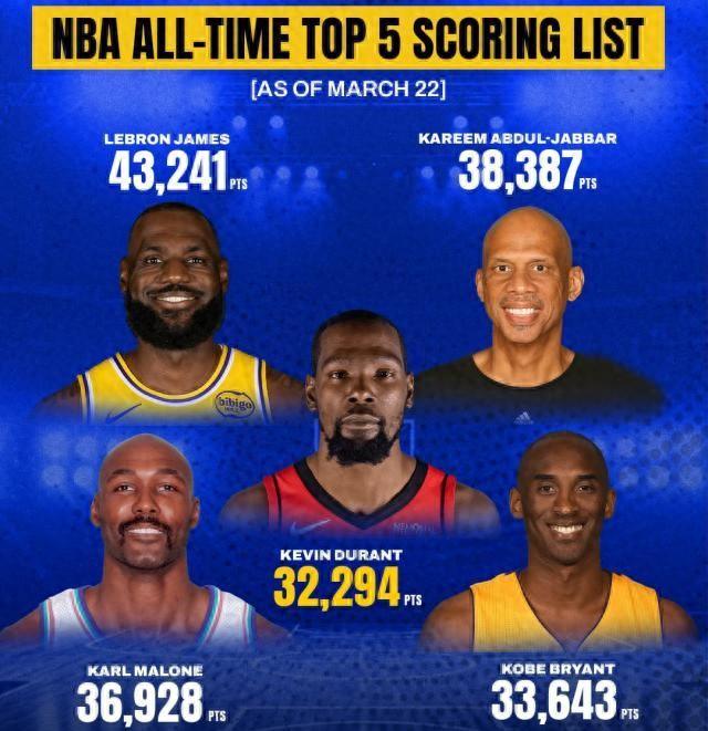 歷史得分榜前四人分別是詹姆斯(43241仍在增加)、賈巴爾(38387)、馬龍(36928)、科比(33643)。科比目前領先杜蘭特1349分,馬龍領先4634分,賈巴爾則領先6093分。