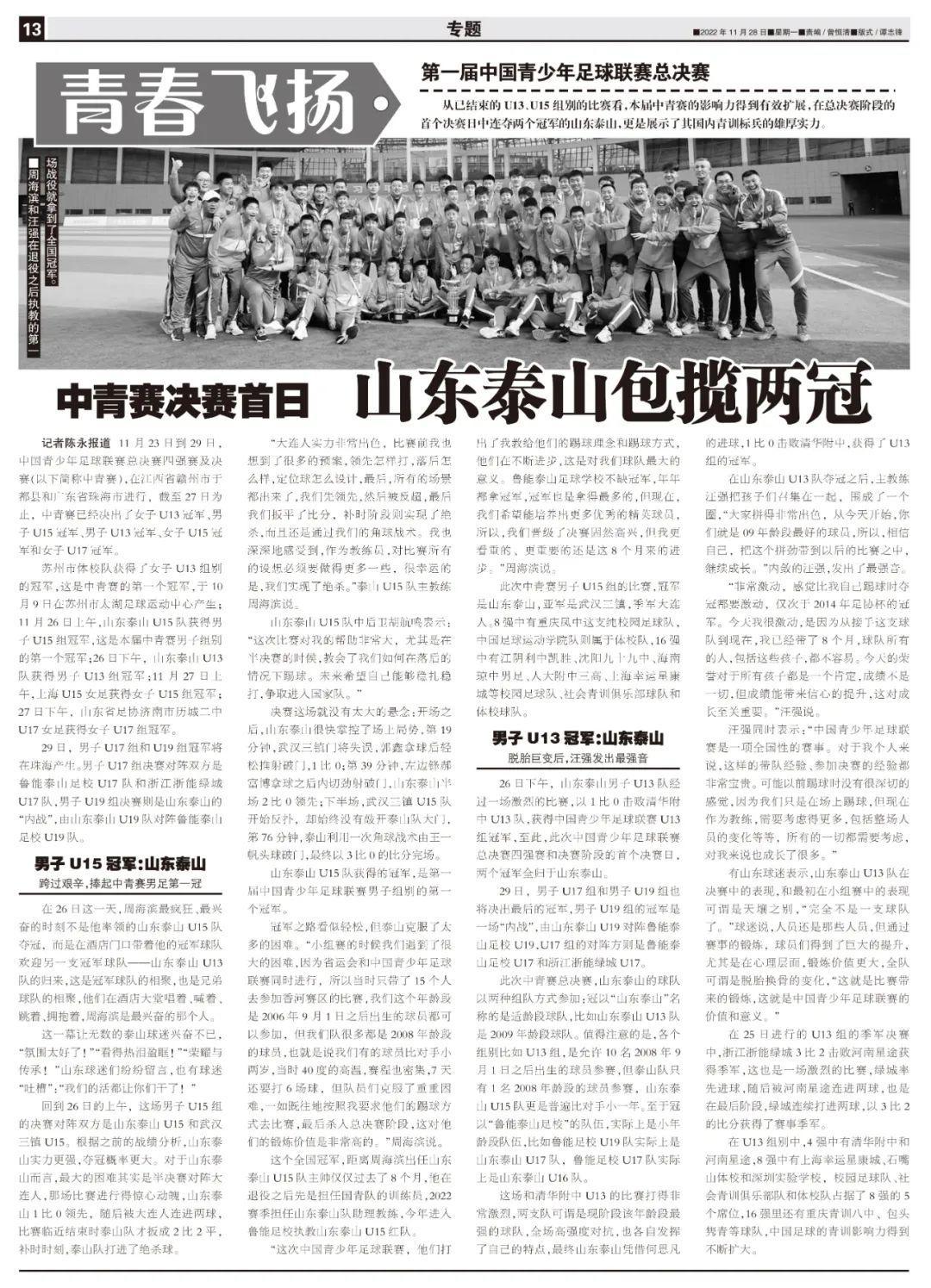 在《中青賽決賽全掃描(上)》,我們將爲大家帶來泰山U13和泰山U15的相關報道。