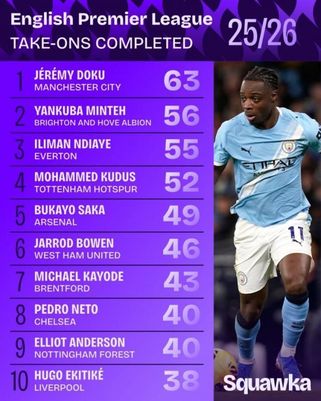 3月24日訊 數據機構Squawka統計出了本賽季英超球員過人數情況,曼城邊鋒多庫以63次居首。