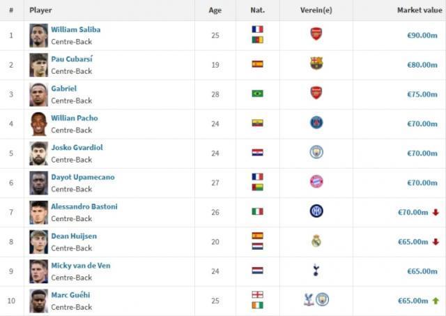 全球中衛身價排名:昔日第一巴斯托尼跌第四,薩利巴9000萬世一衛