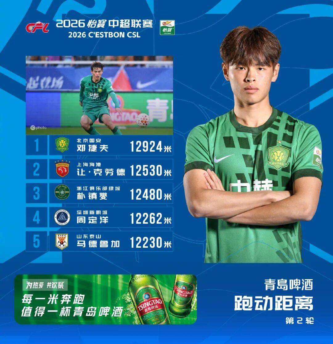 第二輪國安客場對陣泰山,同樣首發打滿全場的鄧捷夫以12924米的跑動距離登頂中超跑動榜,他超越的,是上海海港讓·克勞德、浙江隊樸鎮燮以及深圳新鵬城周定洋,足見這個數據的含金量。